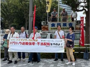 まず午前のノバ・バイオメディカル本社前行動では、駆けつけた組合の仲間たちが会社に対し労働者の正当な要求を力強く訴えました。