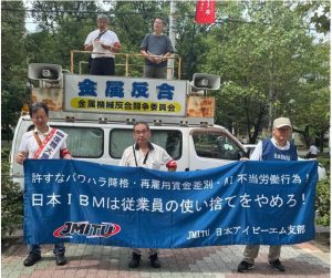 行動では、冒頭、同委員会の生熊委員長は主催者挨拶で、中労委で和解協議中の定年後再雇用不当労働行為事件について、「中労委では和解協議が継続されていますけれども、なかなか進みません。この和解の最中に再雇用労働者の賃金が月18万5千円から25万5千円に変更されるので、若干の前進はありました。しかし、新入社員よりいまだに低い、そういう状況です。しかも団体交渉で決めるのではなくて、決めたことを伝えるというだけです。問題はアメリカ本社の承認を得ないと何も進まないというこの労務政策にあります」と述べ、日本IBMの不誠実な姿勢を厳しく批判しました。