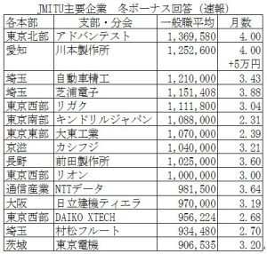 JMITU主要企業の支部分会は昨年冬に続き堅調で、下表の通り90万円を超える回答を引き出しています。