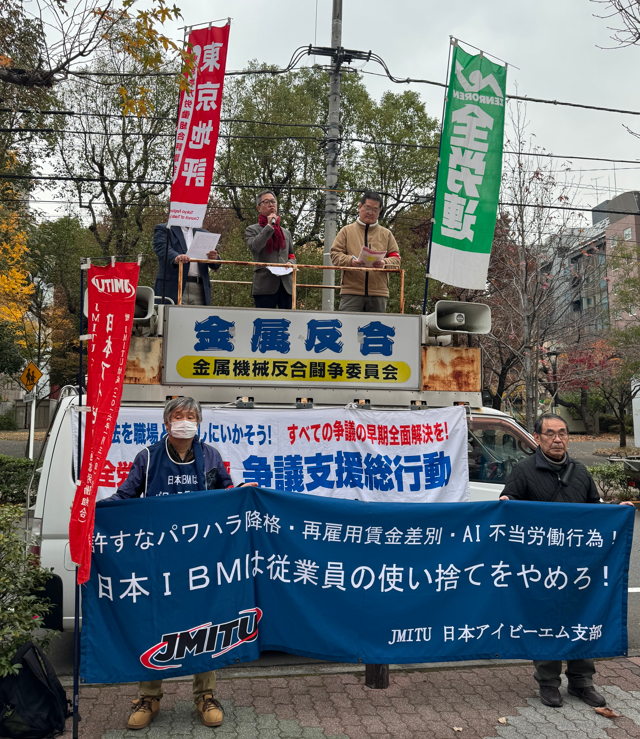 行動では、主催者挨拶、日本IBM支部の争議の経過報告に続き、JMITUノバ・バイオメディカル支部の射場執行委員長は連帯の挨拶で、3年にわたるノバ支部の争議について、「2025年10月29日、東京高等裁判所でついに和解解決を勝ちとることができました。ありがとうございました。これで福岡に戻り、やっと家族と普通の生活に帰ることができます。これは私一人で絶対に成し得なかった結果です。改めて心からお礼を申し上げます。」と述べ、和解解決を報告、支援者へ謝意を表しました。