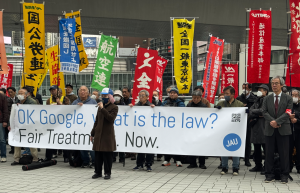 この後、AU支部の小林委員長は争議団・原告の決意表明で次のように述べ、争議解決への支援を訴えました。「グーグルの職場の実態は年々深刻になっているなと感じています。2023年に大規模な退職勧奨がありましたが、そのあと状況は改善していないというのが私の実感です。その大きな原因となっているのは、相対評価による低評価です。グーグルでは5段階の人事評価となっているんですが、10%が下位、2つの低評価が付くことになっています。その低評価が付くと、大幅に賞与が減額されるだけではなく、その後のPIP(業績改善計画)につながる可能性が高いです。これにつながると、達成目標が書かれて、達成目標を達成しなければ解雇になる可能性があるという念書に署名を求められます。その結果、実際に達成できなければ解雇されます。それで解雇された人が訴えている事件が、今JAUが行っている2つの争議のうちの片方、不当解雇裁判になります。グーグルはすごく大きな大企業にもかかわらず、たくさんの法律をないがしろにしてきました。育休・産休中の退職勧奨に始まり、細かいところで言えば、私文書偽造ですね。解雇された人に送られてきた解雇理由書に、理由が解雇ではなく同意による退職勧奨と書かれていたとか、最低ですよね。会社に問い詰めたところ、それはシステム上、そういう選択肢の項目を用意してなかったと説明されました。今では用意してあるそうです。日本の法律を誰もわかってない中、アメリカのルールでそのまま運用してる、それがグーグルの実態です。今、裁判2件行っています。不当解雇裁判、これは12月24日が次の期日です。それから賞与減額裁判、これが2月18日が次の期日となっています。また都労委ももうすぐ終わりそうな件が1件と、もう1件、新しい件を立ち上げようとしています。グーグルの違法行為をJAUは見逃しません。グーグルが正しくあるべき姿に正されるまで、たたかい続けていこうと思っています。グーグルは争議を早期に解決して、正しい姿にすぐに戻って、2件の裁判と都労委全て解決して下さい。」