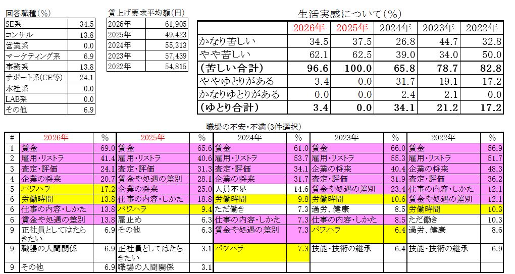 今回は前号に引き続き26春闘アンケートの選択肢方式の回答の集計結果を紹介します。集計結果は、SE系、コンサル、事務系、サポート系など幅広い職種の従業員の皆さんの、賃上げ、生活、職場に関する要求や思いの反映です。